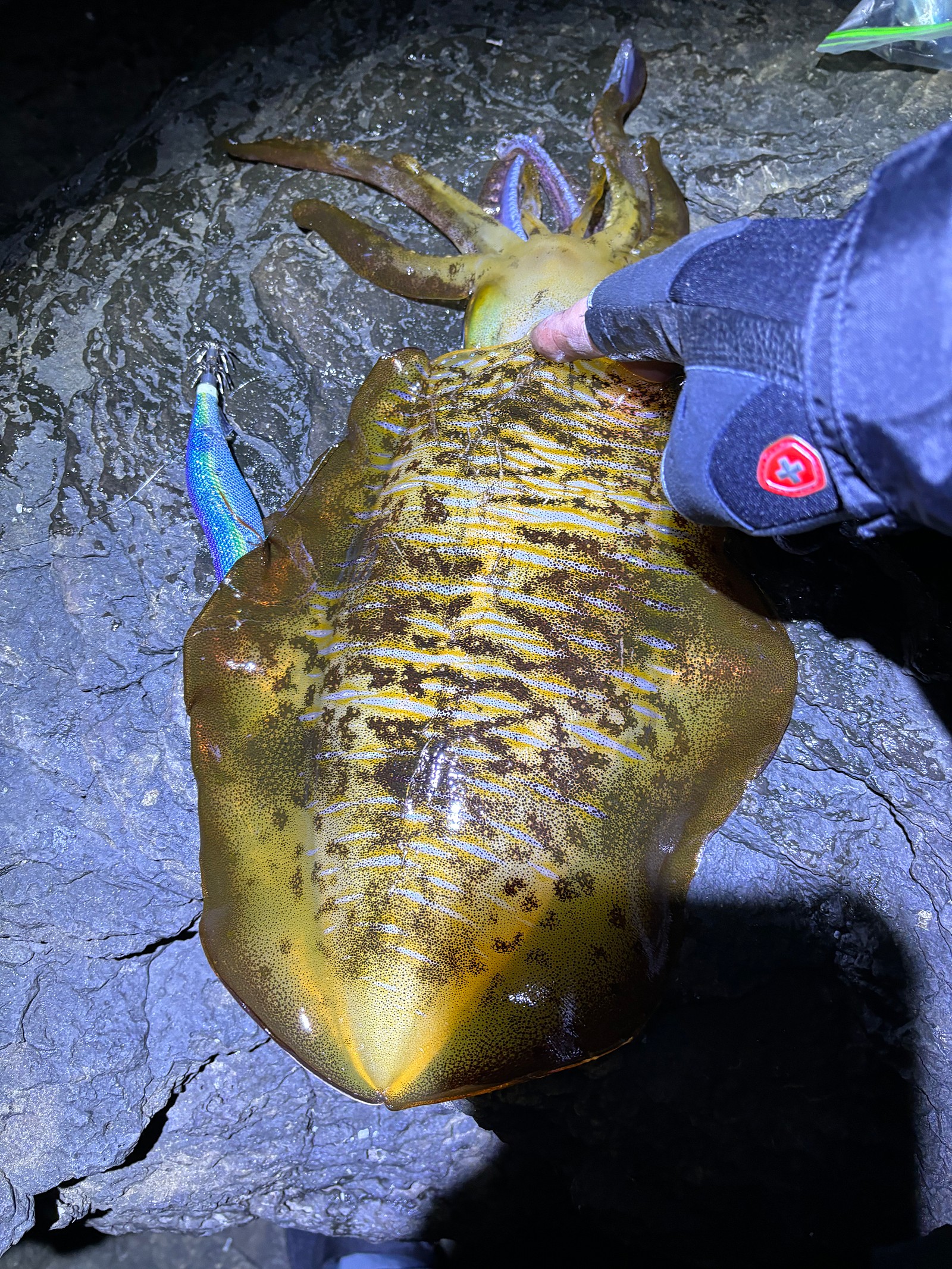 인스타그램 인친이 산북에깅 출조하여 두번재 잡아올린 무늬오징어 입니다. 히트 에기는 쿠로시오 차차스페셜 3.5호 SS 에기입니다. 삼나무 은색에기던가? 아마 그럴거에요~ㅎ